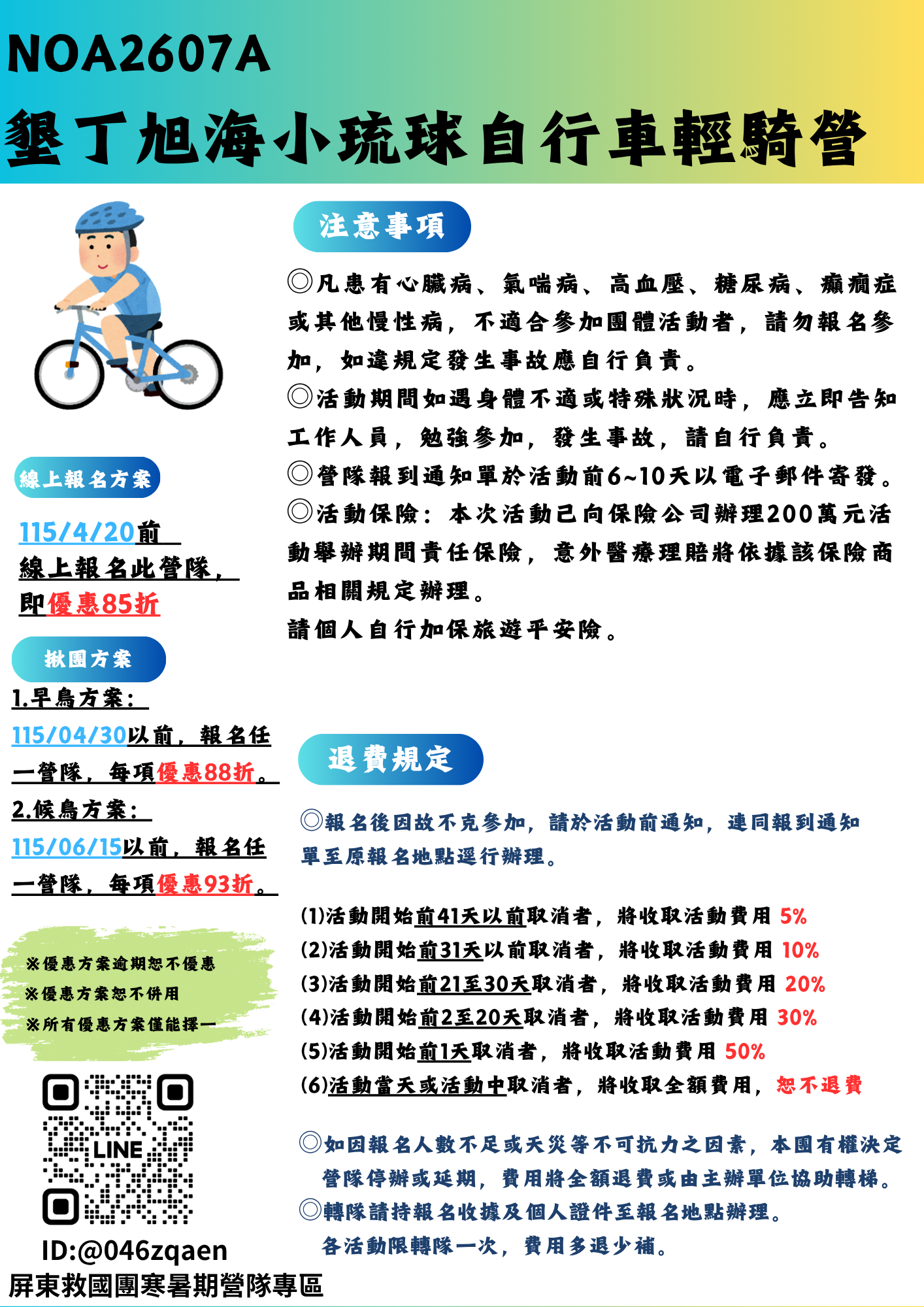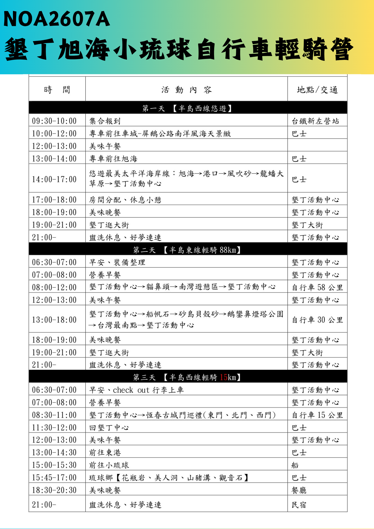 115年屏東縣救國團暑期營:NOA2607A「墾丁旭海小琉球自行車輕騎營」