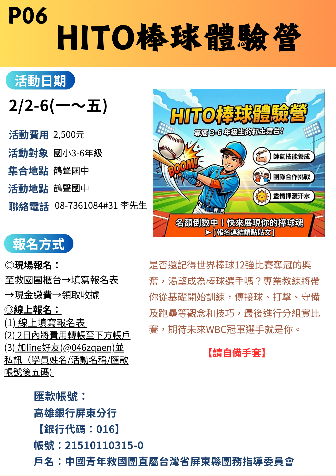 115年屏东县救国团冬令营:P06 HITO棒球体验营