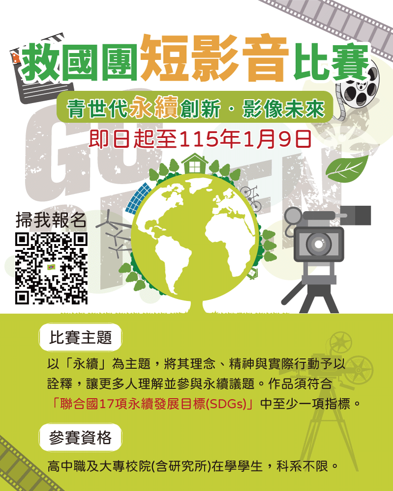 永續不是口號,而是行動 救國團「青世代永續創新•影像未來」短影音比賽即日起開放報名,總獎金高達66000元!同學們!用你獨特的視角和豐富的想像力,告訴所有人,我們要永續與未來!