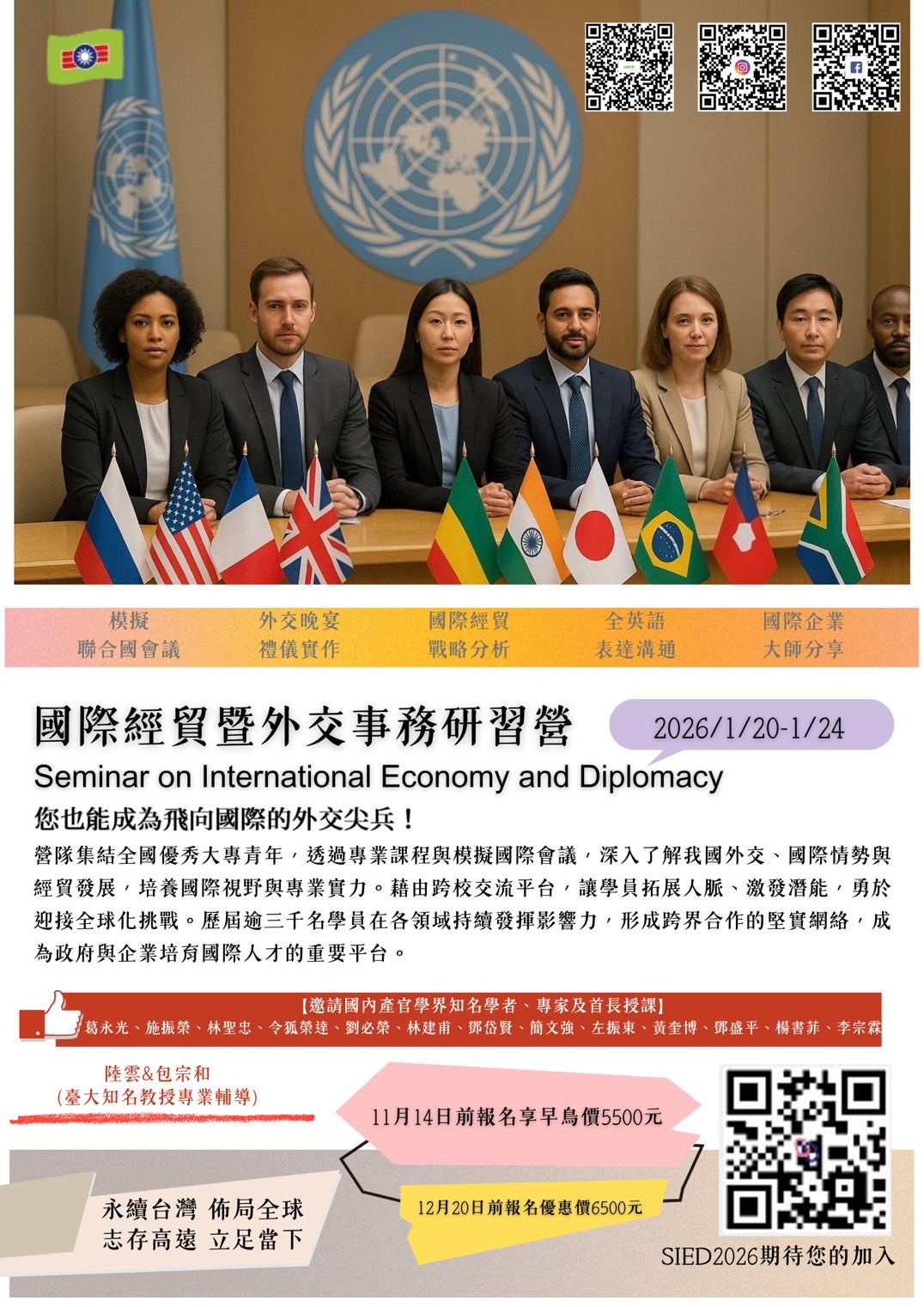 2026年國際經貿暨外交事務研習營開跑囉「國際經貿事務研習營」(SITE)是自1986年以來的頂尖營隊之一。旨在啟發青年學子,培養國際視野,營隊致力於提供高品質的課程和活動,邀請國內優秀的產官學界專家授課。在短短的營期內,學員們能夠真正學習到珍貴的經貿和外交知識,同時體驗團隊生活。37年來這個營隊已經吸引了超過3,000名學員參與,並得到了廣泛的認可。